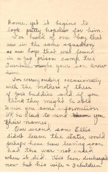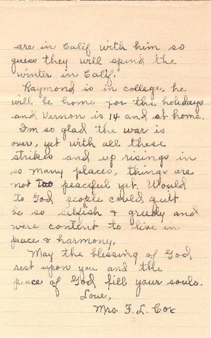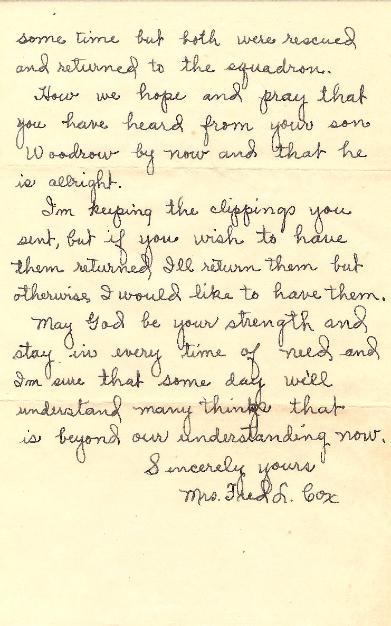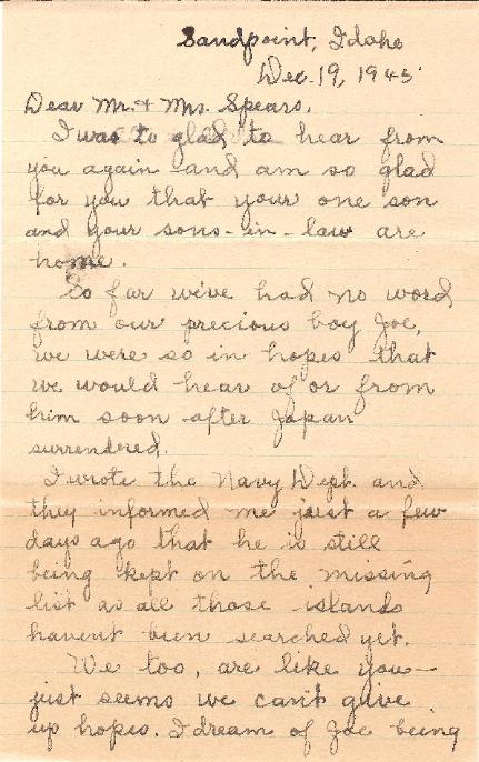 | A second letter from Mrs. Cox to Mrs. Spears dated December 19, 1945. At the time of this second letter, the Cox family still did not know the fate of their son. |