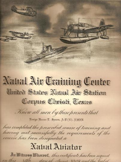 | Spears Flight Log: The flight log of Horace Spears begins with his first flight in February of 1943 in Corpus Christi, Texas. The log book appears to cover most of his training time as a cadet, and continues on until his final training, where he is introduced to the aircraft he will eventually fly into combat. Unfortunately, Spears' combat flight log was not among his possessions this many years later. The flight log covers a time period from February 1, 1943 to April 30, 1944. During this time, Spears accumulated 573.7 hours in flight time. He flew various aircraft during this period including: the Stearman N2S-3, the Vultee SNV-1, the North American SNJ-4 and finally, the Grumman F6F-3 Hellcat, primary fighter aircraft. The front of his flight log appropriately lists all of the issued flight clothing and accessories given to Spears throughout his training. Some of the men who are listed as having provided flight instruction to Spears are shown with only their rank and last name. Some of these names include: Lt. Storey, Ens. Leeper, Ens. Storey, Ens. Helbing, Ens. Mongot, Ens. Paxson, Ens. Landman, Lt. Holt, Ens. Sheldon, Ens. Blair, Ens. DeWitt, Ens. Climmitt, Ens. Linger, Lt. Maxwell, Lt. Price, Lt. Fry, Lt. Mueller, Lt. Goetter, Lt. Terrill, Lt. Bryant, Ens. Sheppiels, Lt. Schaeffer, Ens. Shannon, Lt. MacInnes, Ens. Porodnan, Lt. Petersen, Ens. Hendrickson, Ens. Norman, Ens. Thompson, Lt. Brown, Ens. Nordhansen, Ens. Schanbach, Ens. Winters, and Ens. Hawley. On October 19, 1943, the flight log shows that Spears qualified in carrier landings, flying an SNJ completing his training on the USS Wolverine, a US Navy freshwater aircraft carrier. The USS Wolverine was used as a training ship to qualify Navy pilots in carrier landings. Spears' carrier qualification was signed off by Lt. R. W. Fleming, AV(S) USNR. |