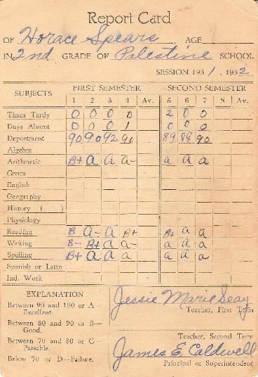 | Judging from his 2nd grade, 1932 report card of nearly straight A's, Horace Edward Spears was a smart and studious young man. A photograph of him near a civilian aircraft prior to his entrance into the United States Navy shows an interest in aviation at a relatively young age. Horace Edward Spears was born on February 20, 1924, Altus, Oklahoma. Spears enlisted in the United States Naval Reserve on June 13, 1942. He received his wings and was commissioned an Ensign on August 14, 1943, at the Naval Air Training Center, Corpus Christi, Texas. Spears attended Carrier Qualification training, and following its successful completion, was posted for active duty with fighter squadron VF-20 on November 12, 1943, aboard the USS Enterprise. The USS Enterprise arrived in Pearl Harbor on November 6, 1943, just days before Spears joined the ranks of VF-20. The Enterprise returned to action on November 19, 1943, off of the Gilbert Islands. The USS Enterprise would take the fight to the very shores of Japan, along with 12 other new carriers. The Enterprise would not return to the United States for 560 days. Ensign Spears would unfortunately never return. |