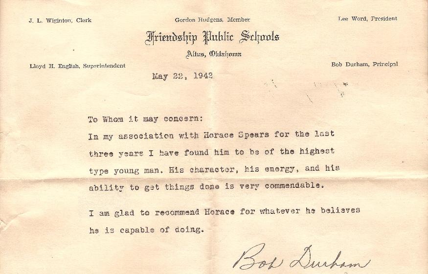 | Above: A letter of recommendation from Spears' grade school principal, Bob Durham, speaking on his character and his drive as a young man. |