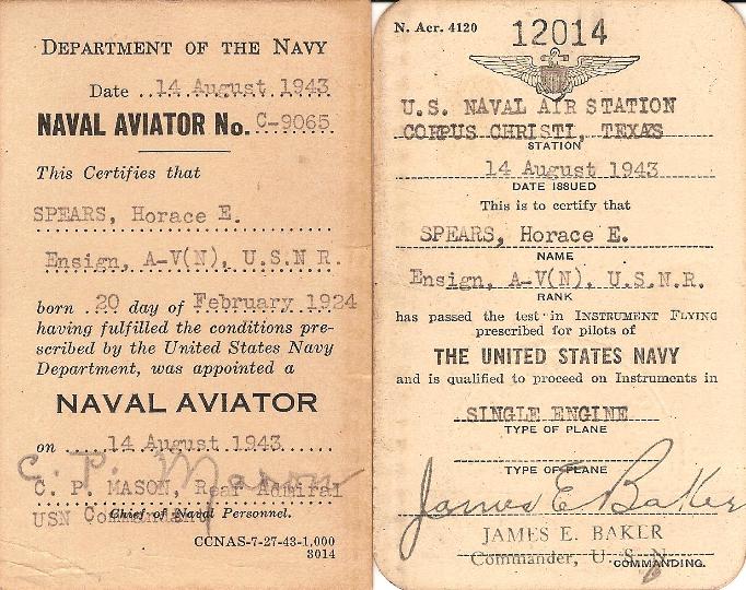 | A recent addition to my private collection was an extensive grouping related to Ensign Horace "Ed" Edward Spears and Ensign Gustave August Wilbur, United States Navy Reserve, both assigned to VF-20, the Fighting Twenty. This very extensive grouping includes a literal pile of paperwork relating to Spears Naval career, his flight log book, photos, medals, insignia, Western Union telegrams and award certificates. Also found among his items were personal letters from his commanding officer, Navy Cross winner and ace, Cdr. Frederick E. Bakutis, and a letter from the Secretary of the Navy during WWII, James Vincent Forrestal. Among Wilbur's items are several wartime photographs, his Naval Aviator certificate, and several other items. What makes this such a special grouping to me is the fact that Ensign Spears and Ensign Wilbur did not survive the war, making the ultimate sacrifice while flying and fighting in defense of our great nation. These items were kept together and well preserved for nearly 66 years before finding their way into my private collection. I am honored and humbled to have the opportunity to not only have possession of these items and ensure their preservation, but to be able to tell at least part of their story. Like all of our servicemen who failed to return home from the war, Ensign Spears and Ensign Wilbur deserve recognition for their sacrifice. I hope in some way, this page provides a fraction of the recognition they deserve. |