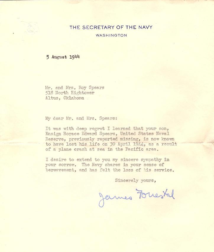 | A letter dated August 5, 1944, sent to the Spears' family from the Secretary of the Navy, James Forrestal. The letter was sent using the Secretary of the Navy's own letterhead and is signed by James Forrestal. |