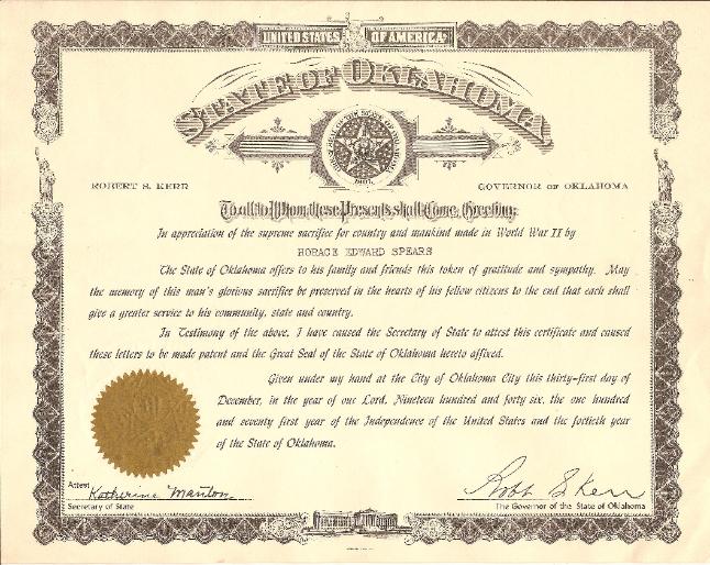 | In the years following the war, the State of Oklahoma would recognize Spears for his military service, sending the Spears family a State of Oklahoma certificate of recognition. The Department of the Navy would posthumously award Spears the World War Two Victory medal and the American Campaign Medal. Both of these medals were mailed to the Spears family in Department of the Navy envelopes. |