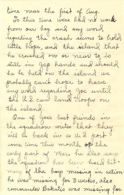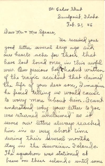 | Above: A letter written by Mrs. Fred Cox to the mother of Horace Spears, dated February 21, 1945. By this time, Mr. and Mrs. Spears had already learned the fate of their son. Mrs. Cox's son, Ensign Joseph E Cox, was a squadron-mate of Horace Spears in VF-20. At the time of this letter, Mrs. Cox had been informed that her son Joseph was missing in action. It would be quite a long time before the Cox family would learn that Joseph had been killed in action. Years later, his aircraft would be located on Yap Island, in the South Pacific. (For additional information concerning Cox and the finding of his aircraft, visit www.missingaircrew.com.) |