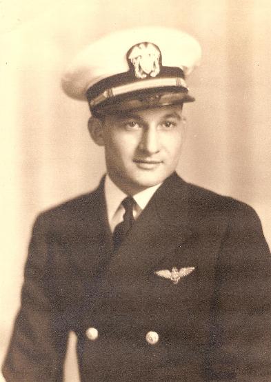 | Two wartime photographs of Ensign Gustave Wilbur, his flight school graduation photo on the left and his official Navy portrait photograph on the right. |