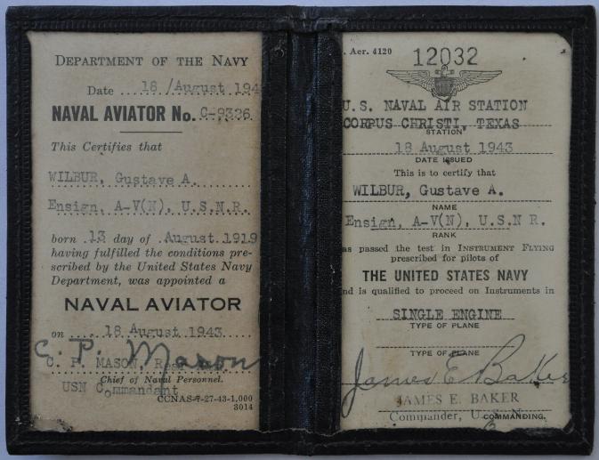 | Wilbur's Naval Aviator certificate. The information shown on the certificate show that Wilbur received his Naval Aviator certificate just four days after Spears had received his. The issuance of the certificate would also have occurred just three days after his 24th birthday. His Naval Aviator number is noted as C-9326. |