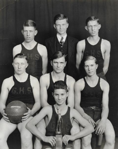 | The Grainton High School basketball team. Wilbur is seated in the second row, far right. His brother is seated next to him in the center of the photograph. |