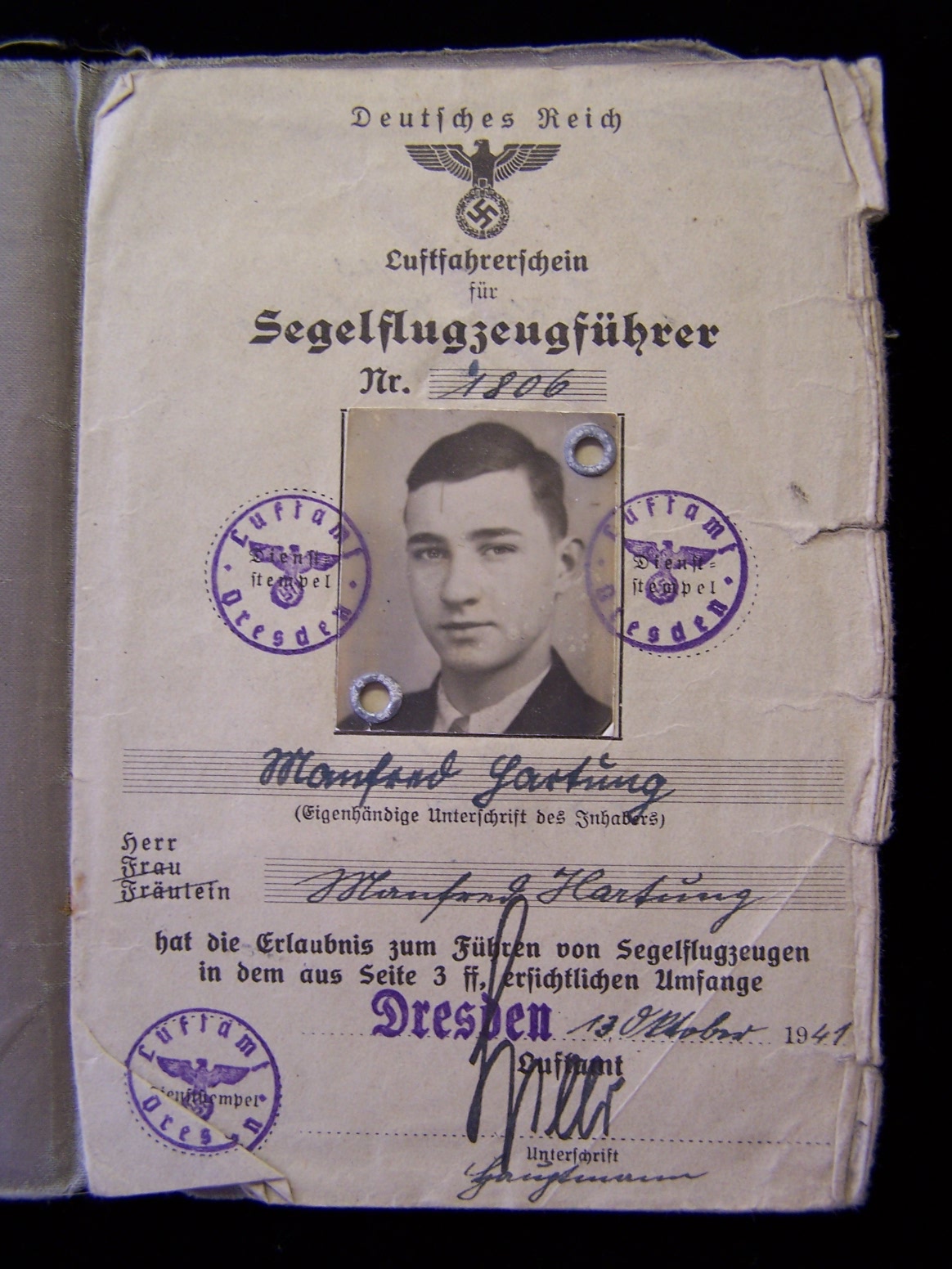 uniform, and his glider pilots license (Luftfahrerfchein fur Segelflugzeugfuhrer) which is dated October 13, 1941. The flight log
