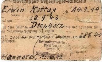 pilot's Segelflieger Ausweis. The small portion of the Ausweis identifies the pilot as Erwin Kottas,