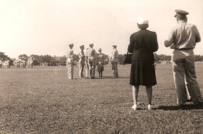 A Fort Des Moines photograph dated August 8, 1942, identifying the three spectators in the foreground of the photo as Maj. Fowler, Col. Faith, and Col. Hobby. |