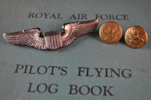 MacGregor's original pair of Army Air Corps wings, displayed with a RAF and RCAF officer's buttons, with MacGregor's RAF pilot flying log book as a backdrop. |