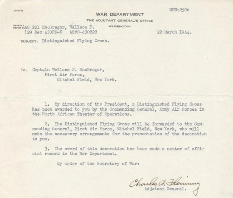 MacGregor sered as a test pilot and attended the Army Air Corps Staff School throughout 1943. From February 15, 1944 to March 4, 1944, MacGregor was assigned to the 442nd FS, 402nd FG at Bryan Field, Texas, undergoing instrument instruction training in the P-47 Thunderbolt. From March 4, 1944 to March 11, 1944, MacGregor underwent Indoctrination and Orientation training with the P-47. MacGregor was then assigned to Hillsgrove Army Air Base in Rhode Island, where he continued his Indoctrination and Orientation training with the P-47 from March 11, 1944 to April 10, 1944. Lt. Col. Levi R. Chase is identified as the Base Commander during this time. From April 10, 1944 to May 16, 1944, MacGregor would continue his training in the P-47, accumulating over 131 hours of flight time in The Jug. On May 17, 1944, MacGregor was assigned as a flight instructor for the P-47, serving in this capacity until October 12, 1944. From October 12, 1944 to November 30, 1944, MacGregor would serve as the Commandant of Trainees, under the command of Lt. Col. George Logan. From December 1, 1944 to May 23, 1945, MacGregor would serve on the Standardization Board under the command of Lt. Col. George Logan and Col. Ivan W. McElroy. MacGregor would end the war having been credited with the destruction of two Messerschmitt Me-109's, a Distinguished Flying Cross (March 22, 1944), the Air Medal with 8 Oak Leaf Clusters (one silver, one bronze), and Campaign medals for Algeria-French Morocco, Tunisia, Sicily, the North African Theater of Operations (dated June 12, 1943), the WWII Victory Medal, and the American Defense Medal. |