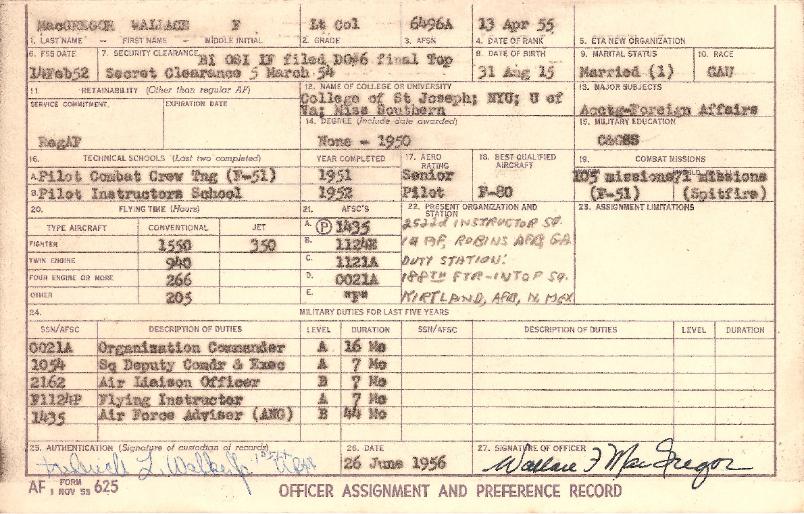 A June 26th, 1956 dated Officer Assignment and Preference Record provides information concerning MacGregor's career. The document shows that MacGregor was operating with a Senior Pilot rating, he had attended a Pilot Combat Crew Training (F-51) in 1951, and a Pilot Instructor School in 1952. His total flight hours to this date shows he had 1900 hours in fighters, including 350 hours in jet fighters, 940 hours in twin engined aircraft, 266 hours in four or more engined aircraft and 205 hours in "other" aircraft. The document shows MacGregor was a qualified P-80 pilot, with 105 combat missions in the P-51, and another 71 combat missions in Spitfires. Other military documents show that MacGregor was a qualified pilot in the P-39, P-40, P-51, P-47, the Spitfire Mk VB, and the P-80. He was also shown to be an expert marksman with numerous military munitions including the Thompson Sub-machine gun. |
