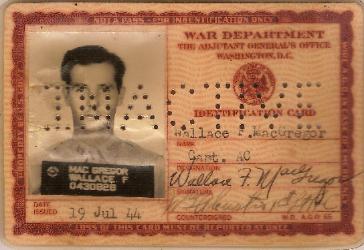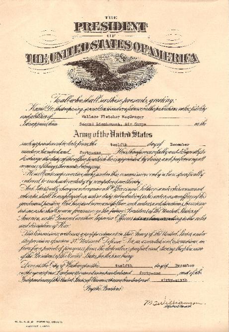 Above, MacGregor's War Department ID card and his Suffolk County AAF ID card. To the right is MacGregor's promotion document to 2nd Lieutenant, dated December 12, 1941, 5 days after the attack on Pearl Harbor. |
