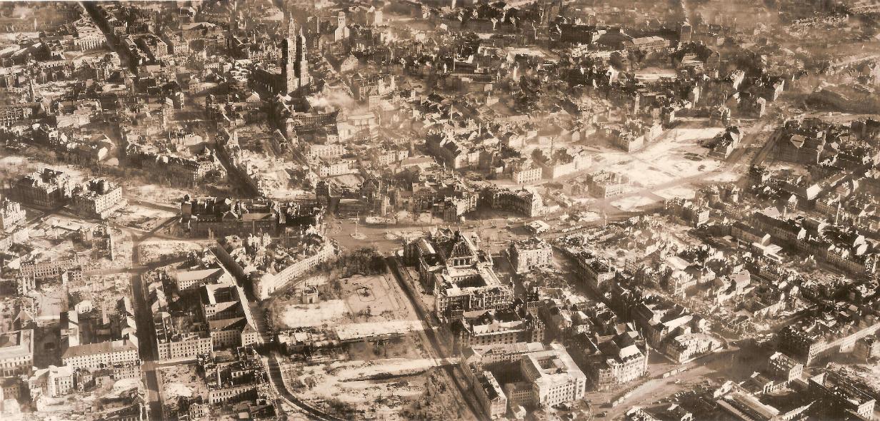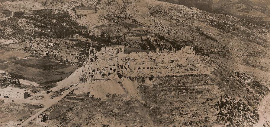 Above and below: among MacGregor's items were 30 aerial photographs showing various locations from the various theaters of war. These photographs measure approximately 10 x 5 1/2 inches in size. Above, an aerial photograph of the devastation of Weisbaden, Germany, with the photographs below showing the well known and well documented destruction of Monte Cassino Abbey, Italy. |