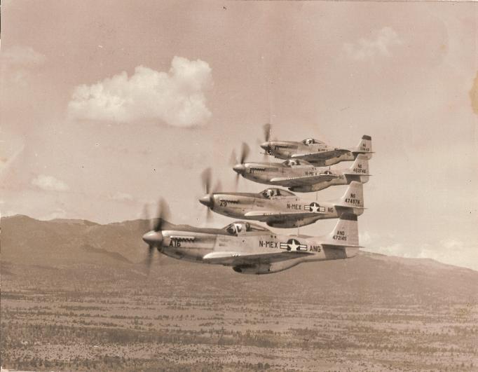 A photograph from MacGregor's grouping shows a post-war formation of F-51 aircraft from the New Mexico Air National Guard. The pilots of the aircraft in the photo are identified as: (bottom to top) Major R.R. McCord, Captain Herman, Captain Clay Keen and Captain Doc Savage. Documents in MacGregor's grouping indicates these aircraft were most likely flying out of Kirtland Air Force Base in New Mexico at the time the photograph was taken. |