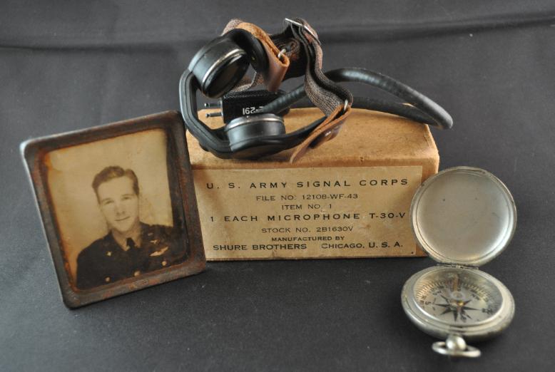 A few more mementos from MacGregor's service time. A small photograph of MacGregor in his Air Corps uniform is displayed along with a military style compass and MacGregor's T-30-V microphone, still contained in its original issue box. Of interest is the Shure Brothers manufactured throat microphone, specifically the box it is contained in. This is an early type of box used by Shure Brothers, and one is that is not as common as later and more commonly encountered thin, cardboard style box. |