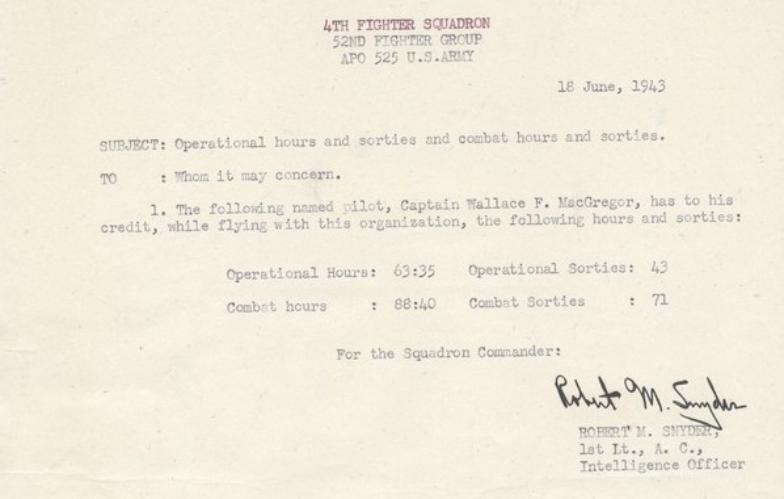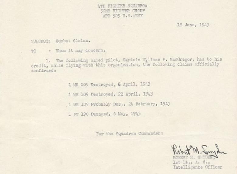 From December 12, 1941 to December 31, 1942, MacGregor would serve in England and North Africa, flying with the 4th Fighter Squadron (FS), 52nd Fighter Group (FG) as a fighter pilot under Element Leader Captain R.K. Russell. From January 1, 1942 to June 12, 1943, MacGregor served as a fighter pilot and Operations Officers for the 4th FS. MacGregor would be credited with the following combat victories: *February 24th, 1943 - One Me-109 probable kill. *April 4th, 1943 - One Me-109 destroyed. *April 22nd, 1943 - One Me-109 destroyed. *May 6th, 1943 - One Me-109 damaged. |