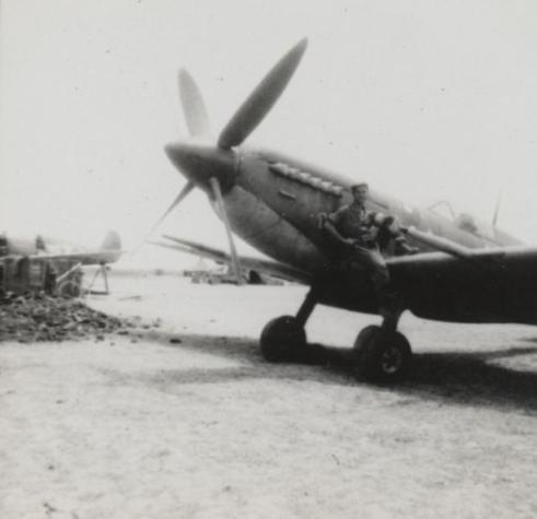 Two photographs of MacGregor in his Spitfire Mk VB. The photograph on the right shows MacGregor sitting in the Spitfire cockpit with writing on the reverse indicating the photograph was taken during MacGregor's introduction to the Spitfire in Northern Ireland. Barely visible on MacGregor's leather flight jacket is the squadron patch for the 4th Fighter Squadron. Also of interest is MacGregor's RAF flying kit. |
